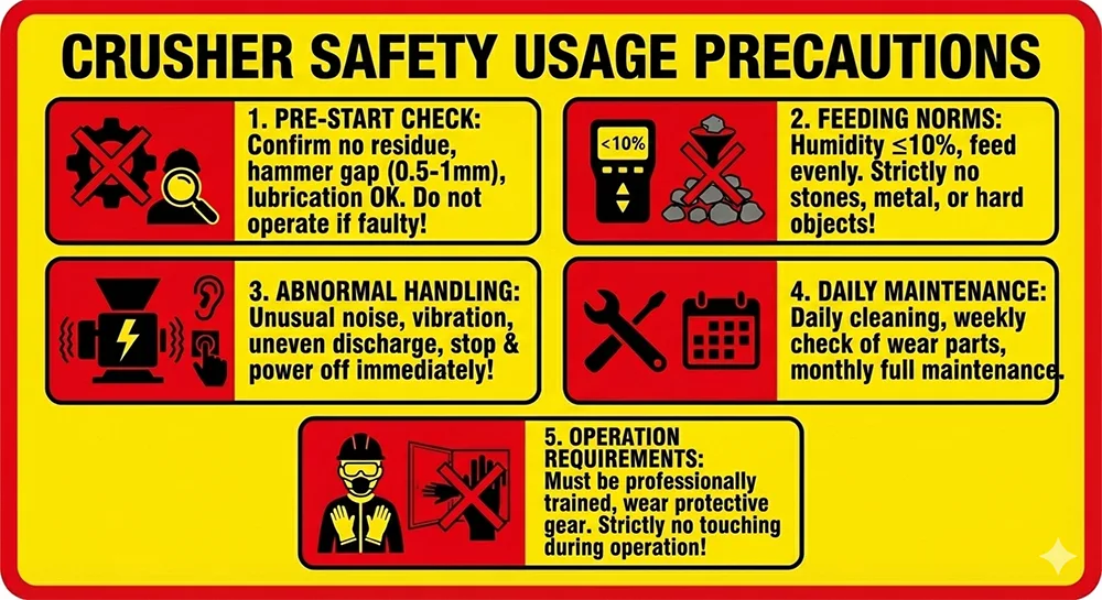 시동 전 분쇄실에 남은 물질이 있는지 확인한 후 해머 헤드와 라이닝 플레이트 사이의 간격을 확인하십시오. 이 간격은 0.5-1mm 사이로 조절되어야 합니다. 동시에 윤활 시스템의 오일 레벨이 충분한지, 파이프라인이 막히지 않는지 확인하십시오. 이 모든 사항을 확인하고 문제가 없으면 기기를 켜십시오.
